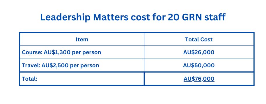 The course costs around AU$1,300 per person and we are hoping to make this training accessible for 20 of our staff from developing countries. Each participant will have travel costs of approximately AU$2,500.